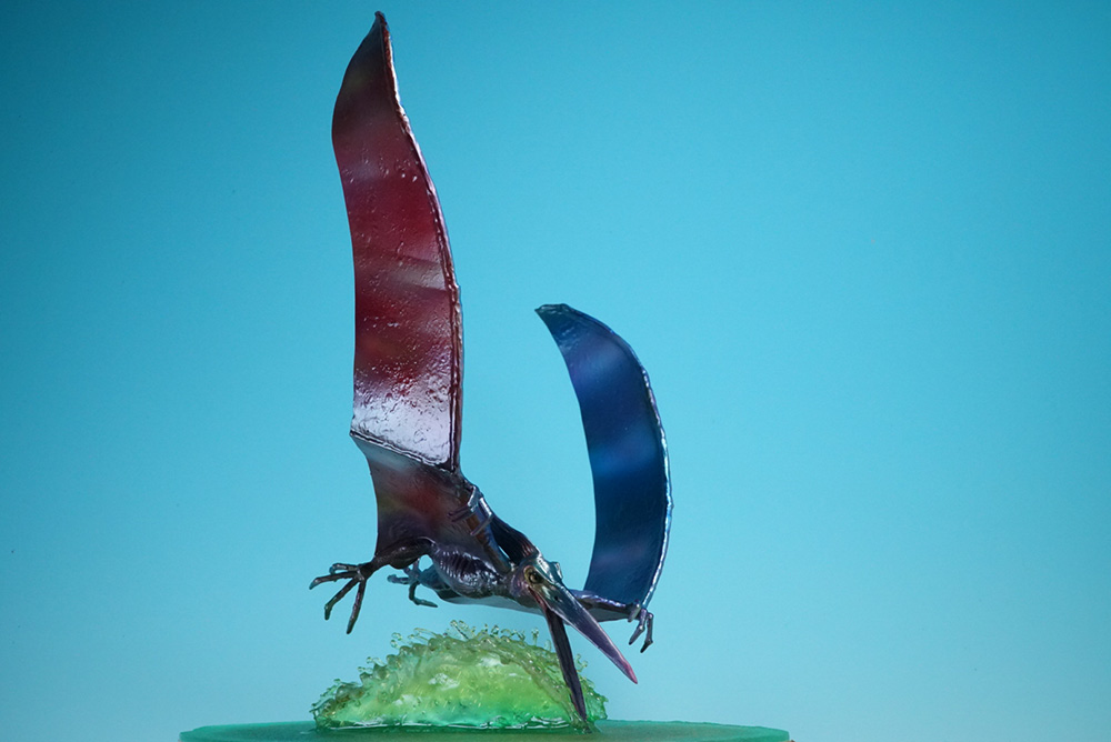 プテラノドンは青基調と赤基調のマジックアワーで塗装。同時期にタミヤの模型コンテストに向けて写実主義な作品を制作していたこともあり、その反動で理想主義100%のカラーリングで塗装しました。