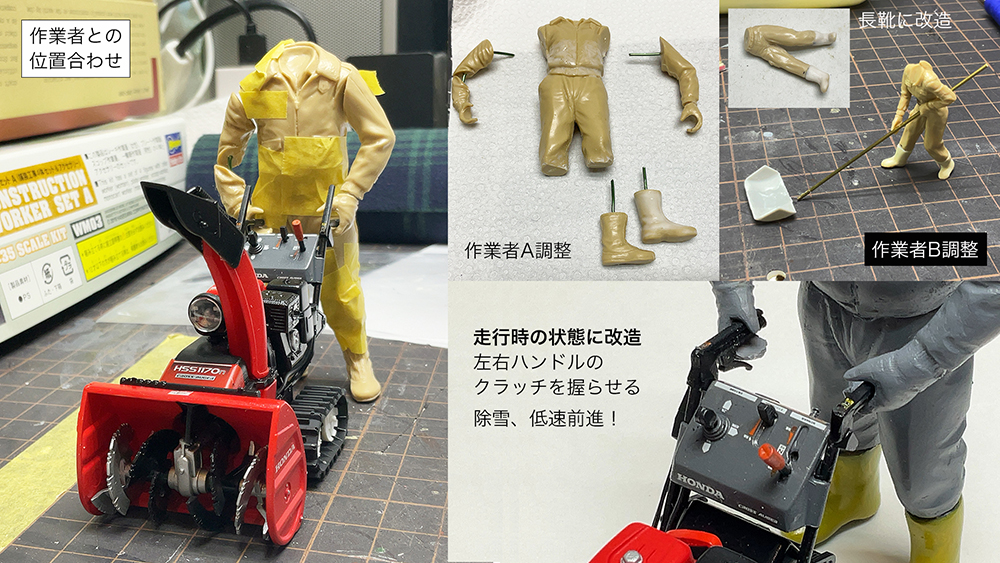 フィギアセットAのパイロットをベースに、腕の角度や位置、足の長さを調整し、長靴・冬用ジャンパー・ヘルメット着用のおっちゃんに改造。またハセガワの建設作業員セットAからも除雪応援に来て頂きました。