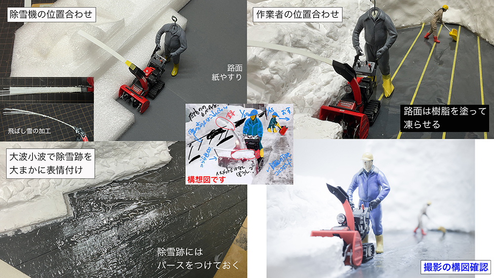 除雪の山は発泡素材+百均ねんどにて作製、路面には紙ヤスリ、その上に透明アクリル樹脂を薄く塗布、「大波小波」「テクスチャーペイント」「深雪」を使用して仕上げました。