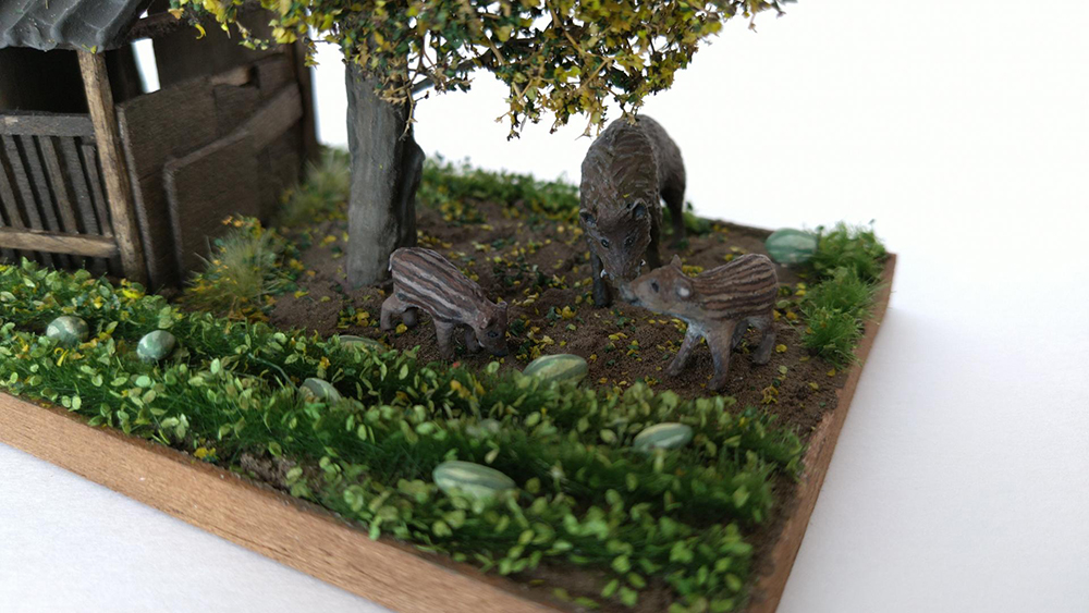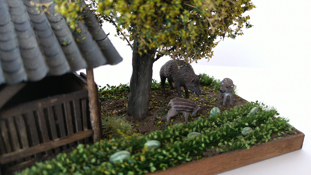 ウリは紙粘土と銅線で作り、葉やツタの部分と花は、ミニネイチャーの素材、畑の土はタミヤの「情景テクスチャーペイント」です。