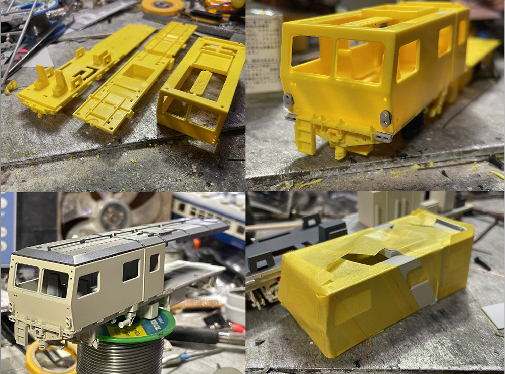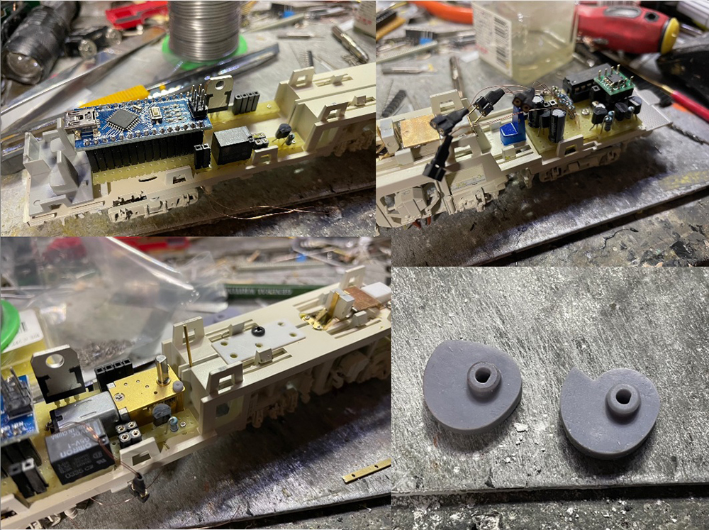 この車両は線路の砂利を固めるの仕事の車両でキットでも爪が動くようになっていますが当然機械的に動く構造にはなっていません。この爪を何とか動かしたいと思ったのが地獄の始まりで、爪を上下させる機構を限りある車内空間に収めるのが大変な上に遠隔操作で爪の動作をON,OFFしたりする機能を埋め込むのにも苦労しました。結局ロータリーエンジンのようなおにぎり型の部品を回転させて機構を動作させるようにして何とか組み込みました。爪も最大限下へ降下させるため爪が動作している間は走行用モーターへの回路をカットして力行できないように回路とプログラムを工夫して車内空間に収めつつ思いつく限りの機能を詰め込みました。