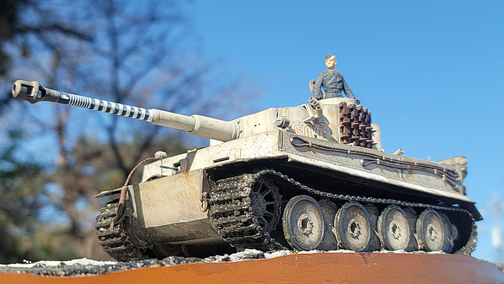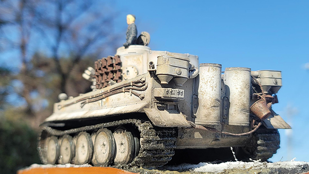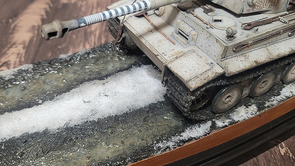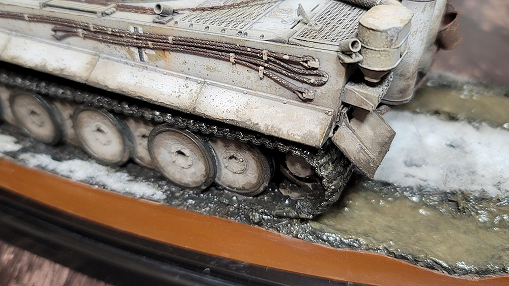 プランニングではジャーマングレーで作る予定でした。しかし、『ミハエル?ヴィットマン』搭乗の冬季迷彩に魅せられてプランを変更。