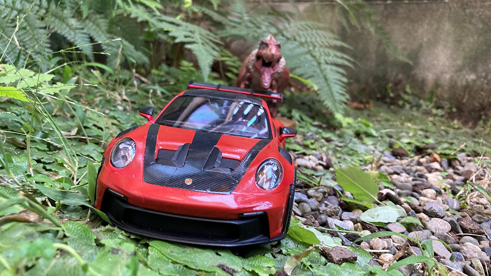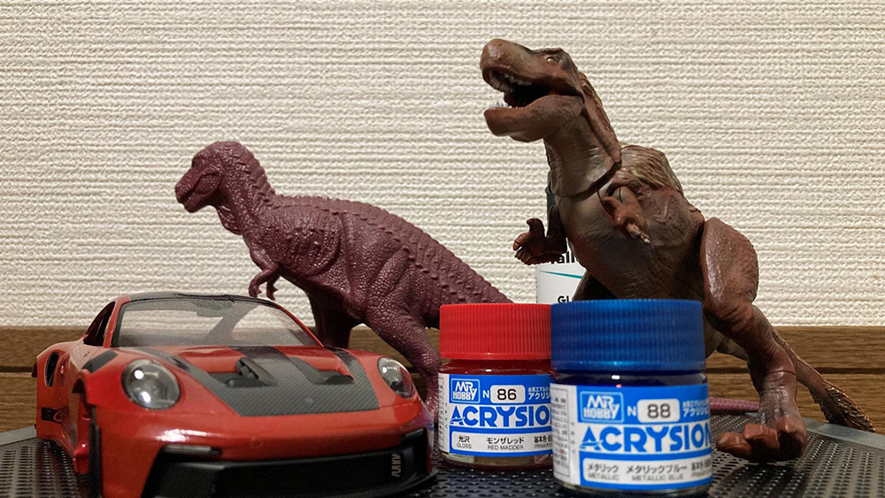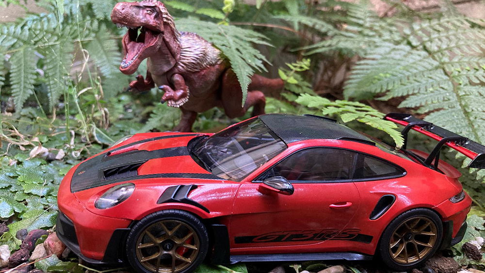今年はどうしようか考えたとき、ふとタイトルが浮かび、子供の頃から持っているティラノのフィギュアが赤かったのでポルシェとティラノを合わせてみました。