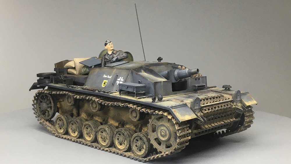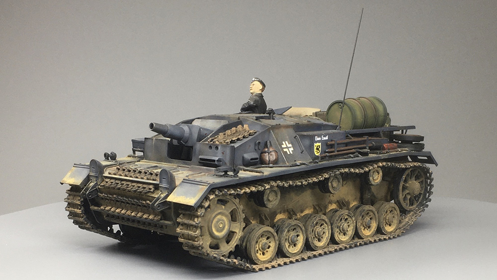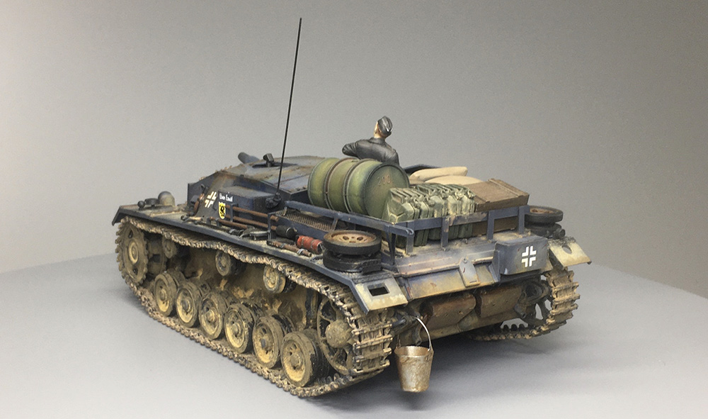YouTubeやインスタを参考に履帯のサビ表現をして製作しました。後ろに乗っている木箱は、プラ板で自作し、布などはエポパテを使って作りました。