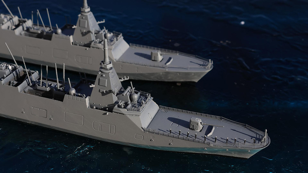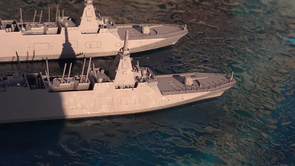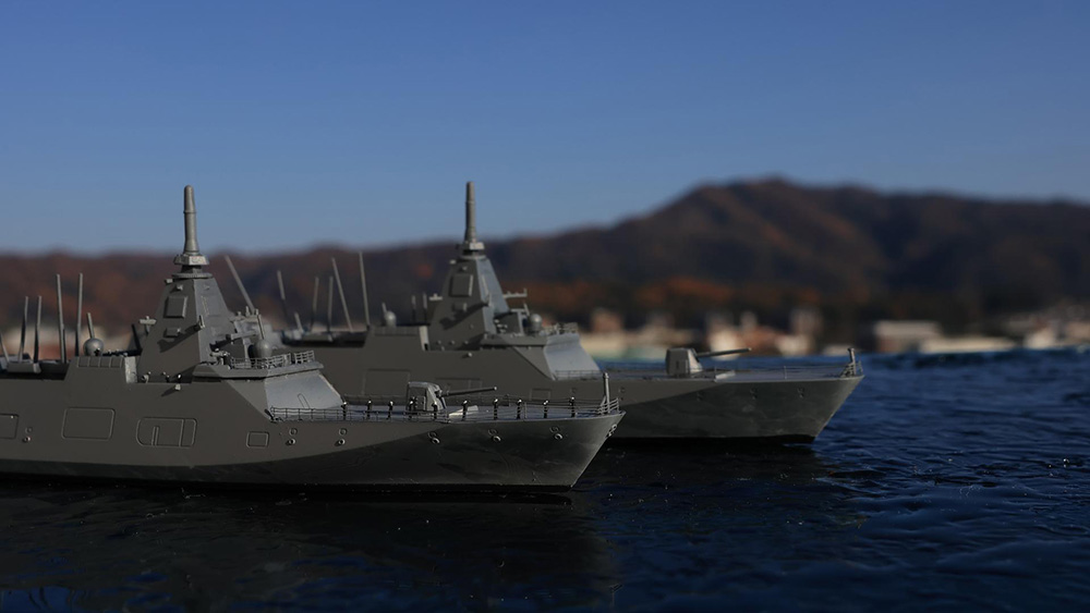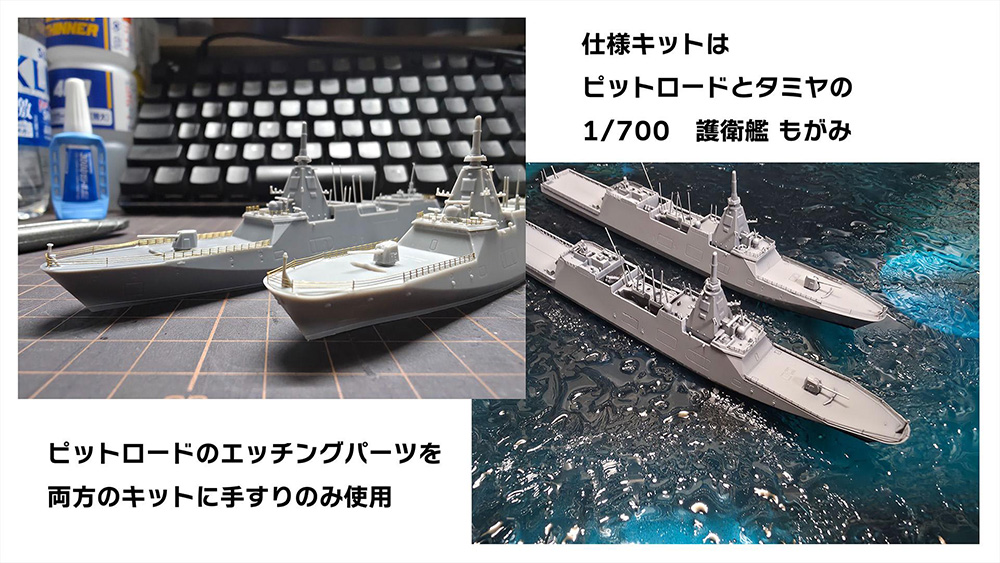 少し前にチョートクさんが雑誌作例で作っておられたタミヤ・護衛艦もがみ 2隻に感化され『チョートク・リスペクト・もがみ』となります。自分の作品はピットロードとタミヤ両方のキットを使用し、最低限のエッチングパーツのみを使用して作ってみました。