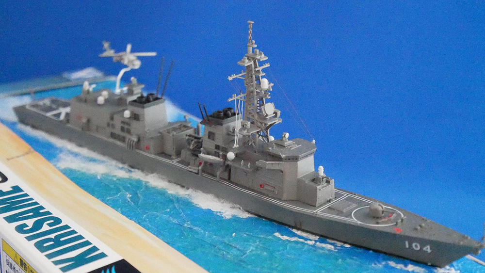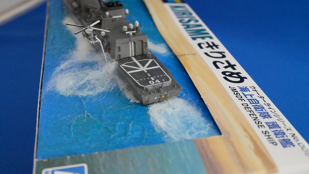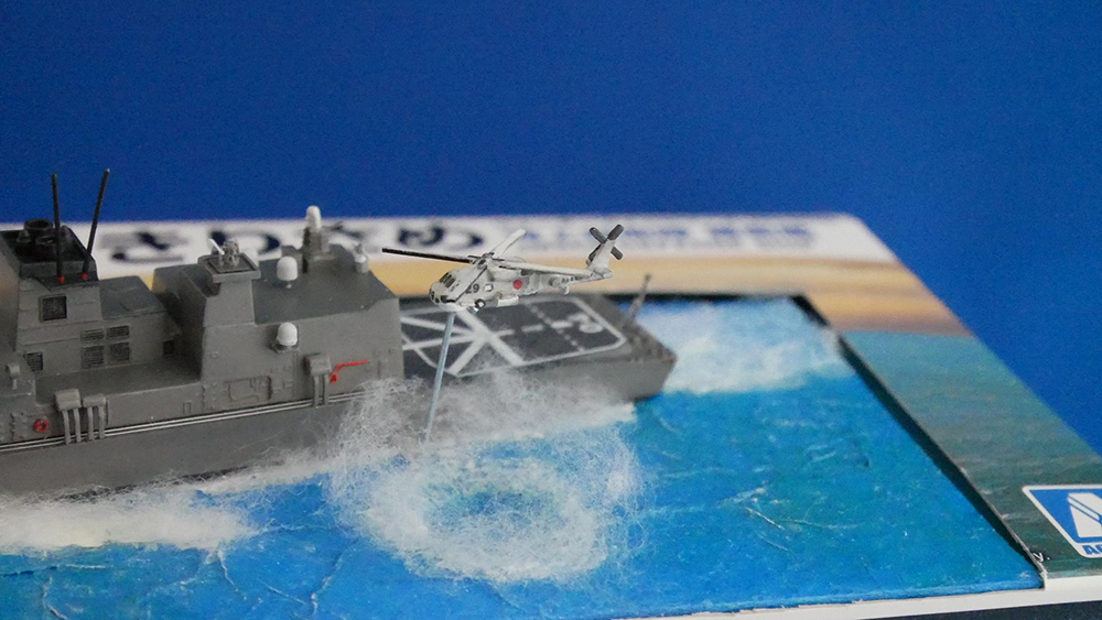 今回はディティールアップとジオラマの波の表現に挑戦し、護衛艦から哨戒ヘリが飛び立ったシーンを作りました。