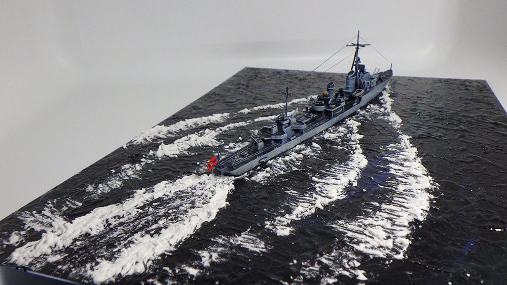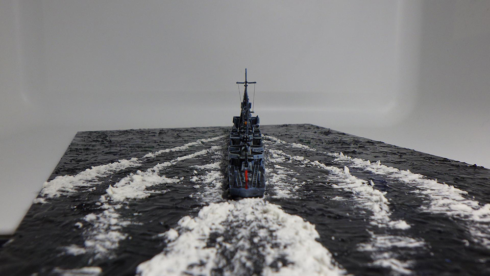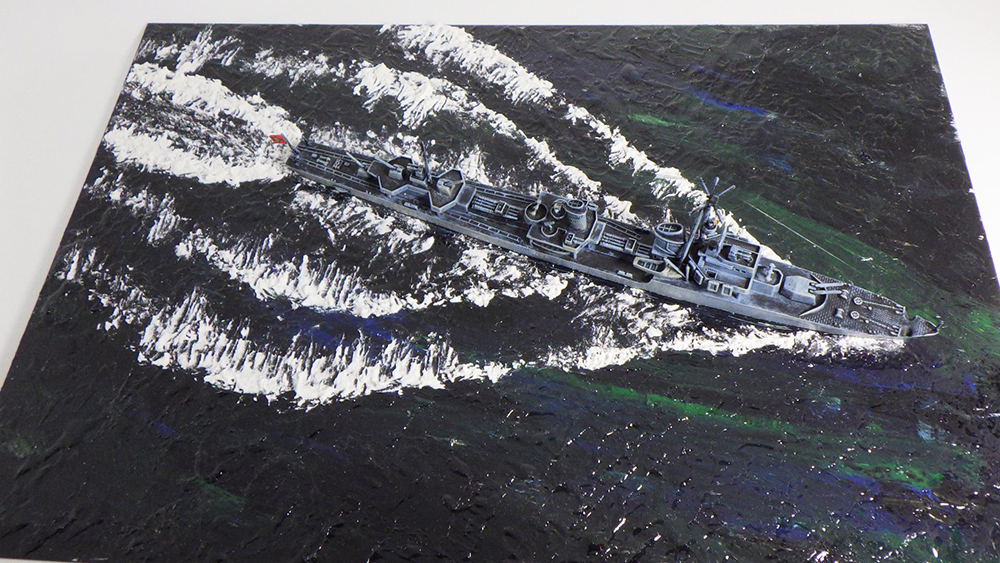 大西洋、嵐の前触を感じながら戦場海域に向かう戦闘艦とどんよりした天候を暗い海で表現(海:プラバン→アクリジョン→大波小波and粉雪ホワイト)