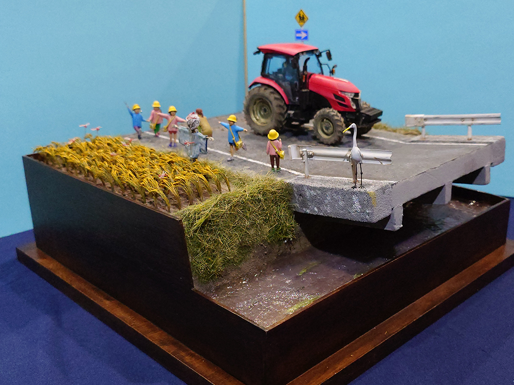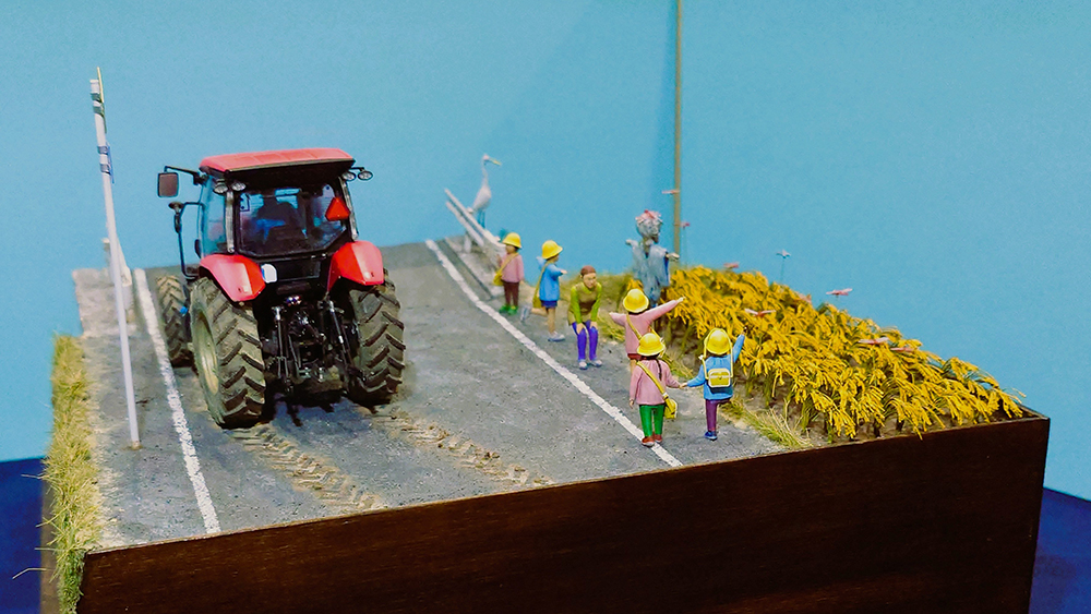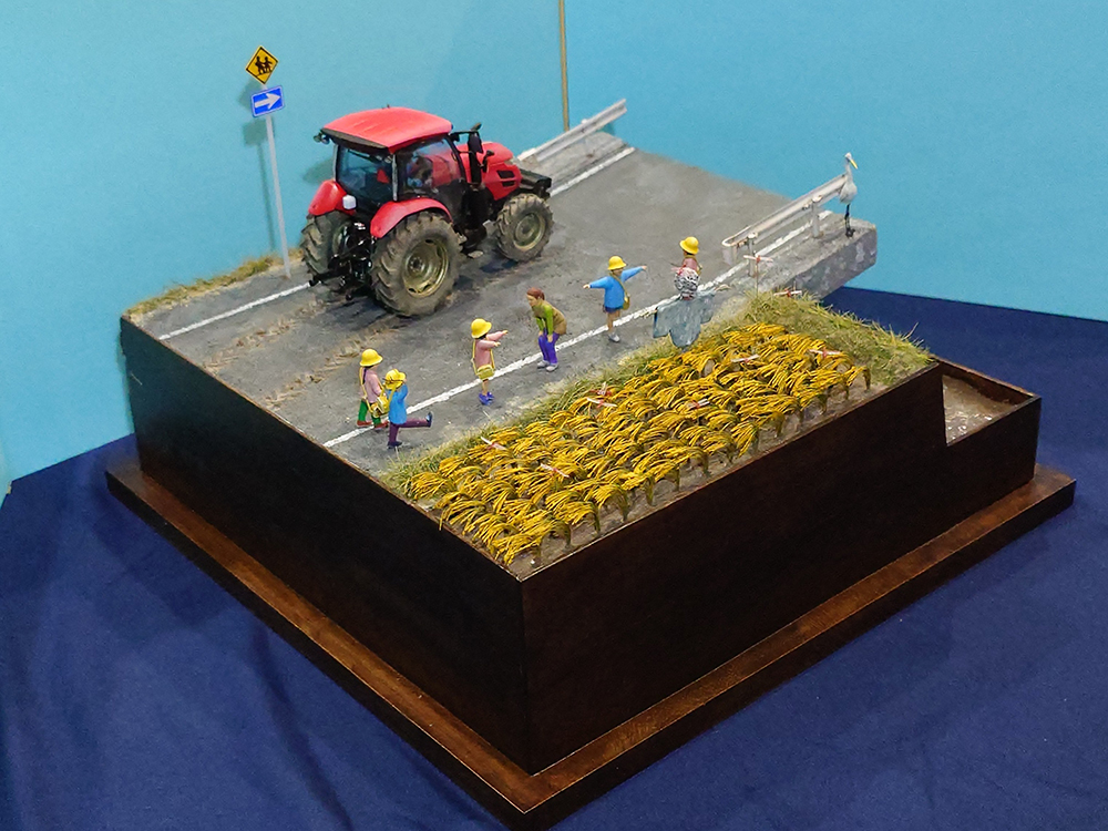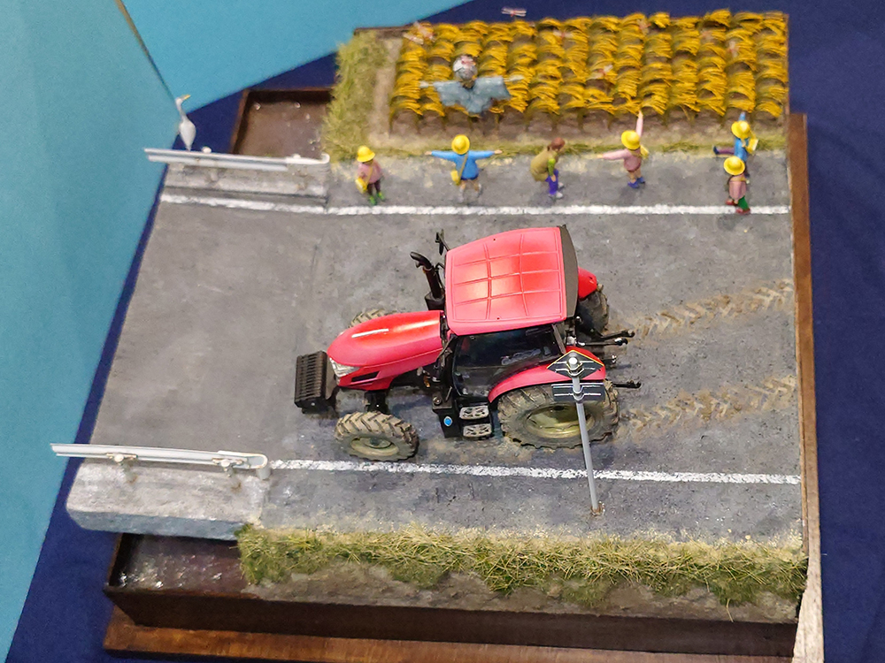道理標識はプラバンで製作し、サギはタミヤの1/35動物セットのガチョウを改造して製作しました。