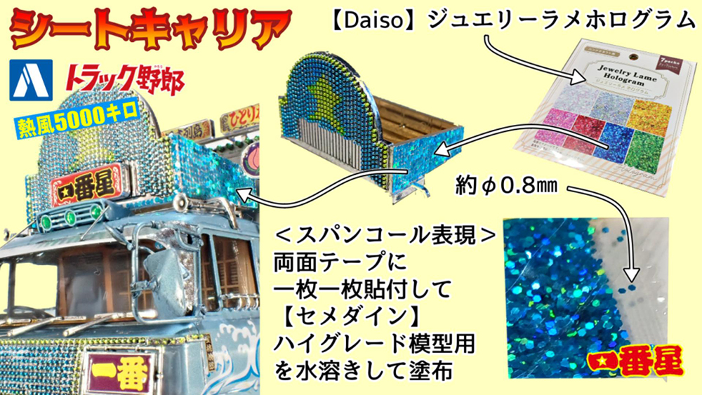 ・4枚目画像 実車のシートキャリア側面はスパンコールがキラキラ光るようになっていますが、キットではデカールの表現のため、色々検討した結果、「ジュエリーラメホログラム」をダイソーで発見、一枚一枚貼付する苦行により納得の仕上がりとなりました