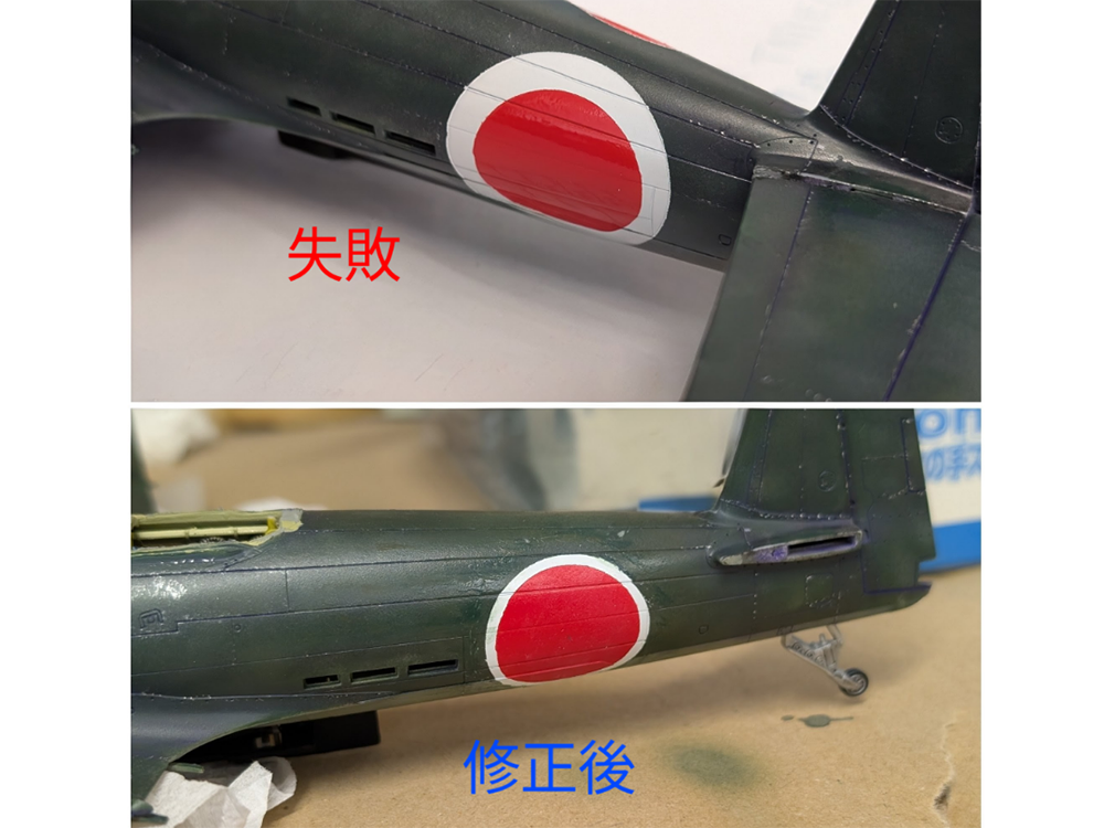 3つのエラーは、日の丸マスキングの円サイズを間違えたこと、エナメルによるウォッシングのふき取りに